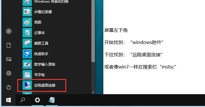 1、在您电脑屏幕左下角开始菜单,windows附件,找到“远程桌面连接”,或搜出“mstsc”,