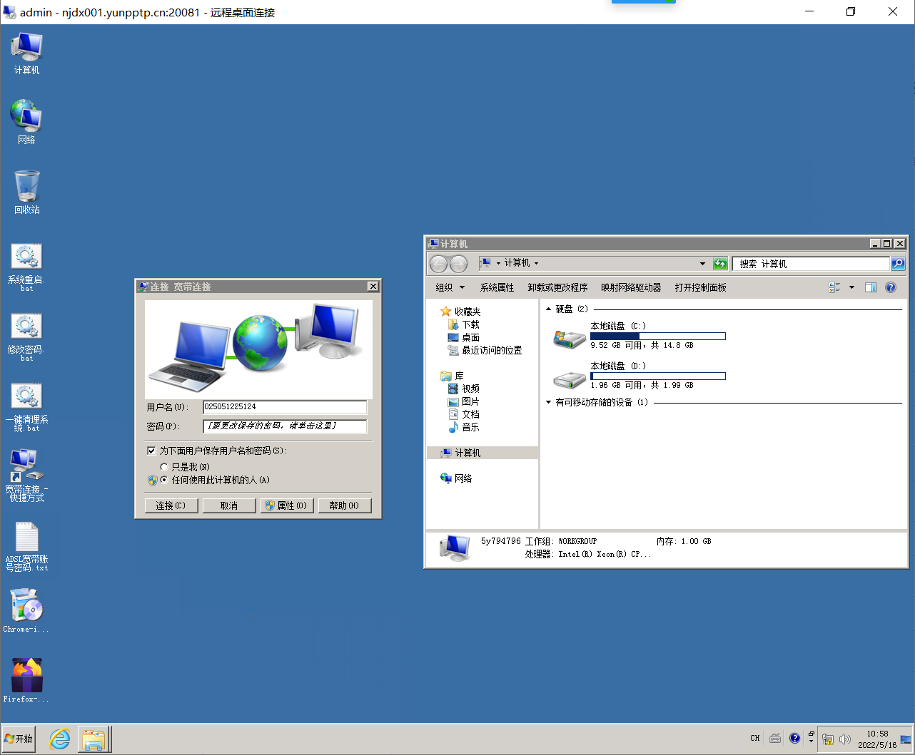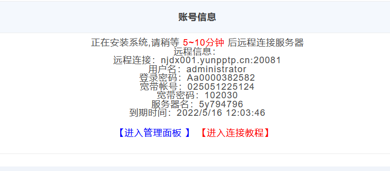 2、开通成功,显示服务器信息:远程地址 用户名 密码 宽带账号 宽带密码,稍等即可连接→ →